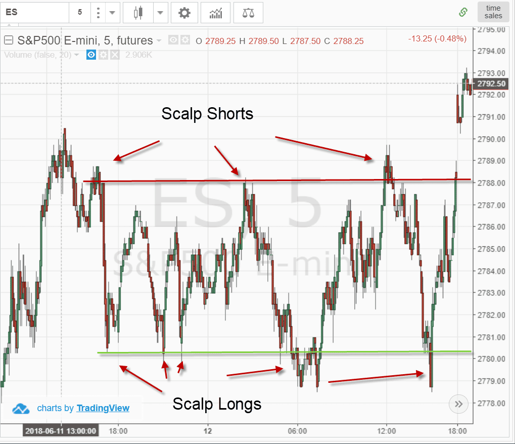 Cas concret : sur l’E-mini S&P Futures, lorsque les fluctuations sont canalisées, on enchaîne facilement plusieurs trades de scalping par jour.