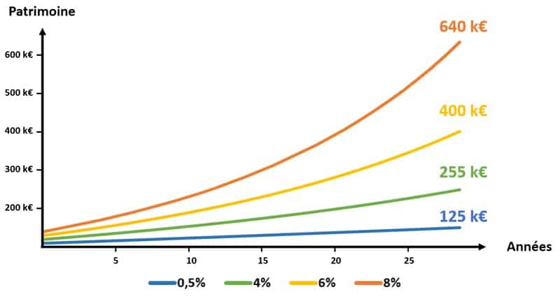Optimiser son patrimoine, c’est s’offrir la possibilité de faire fructifier son épargne au fil du temps. Un écart minime de rendement, sur trente ans, fait toute la différence. Prenons un cas concret : un capital de 25 000 €, alimenté chaque mois par 250 € d’épargne. Après trois décennies, voici l’impact du taux de rendement :